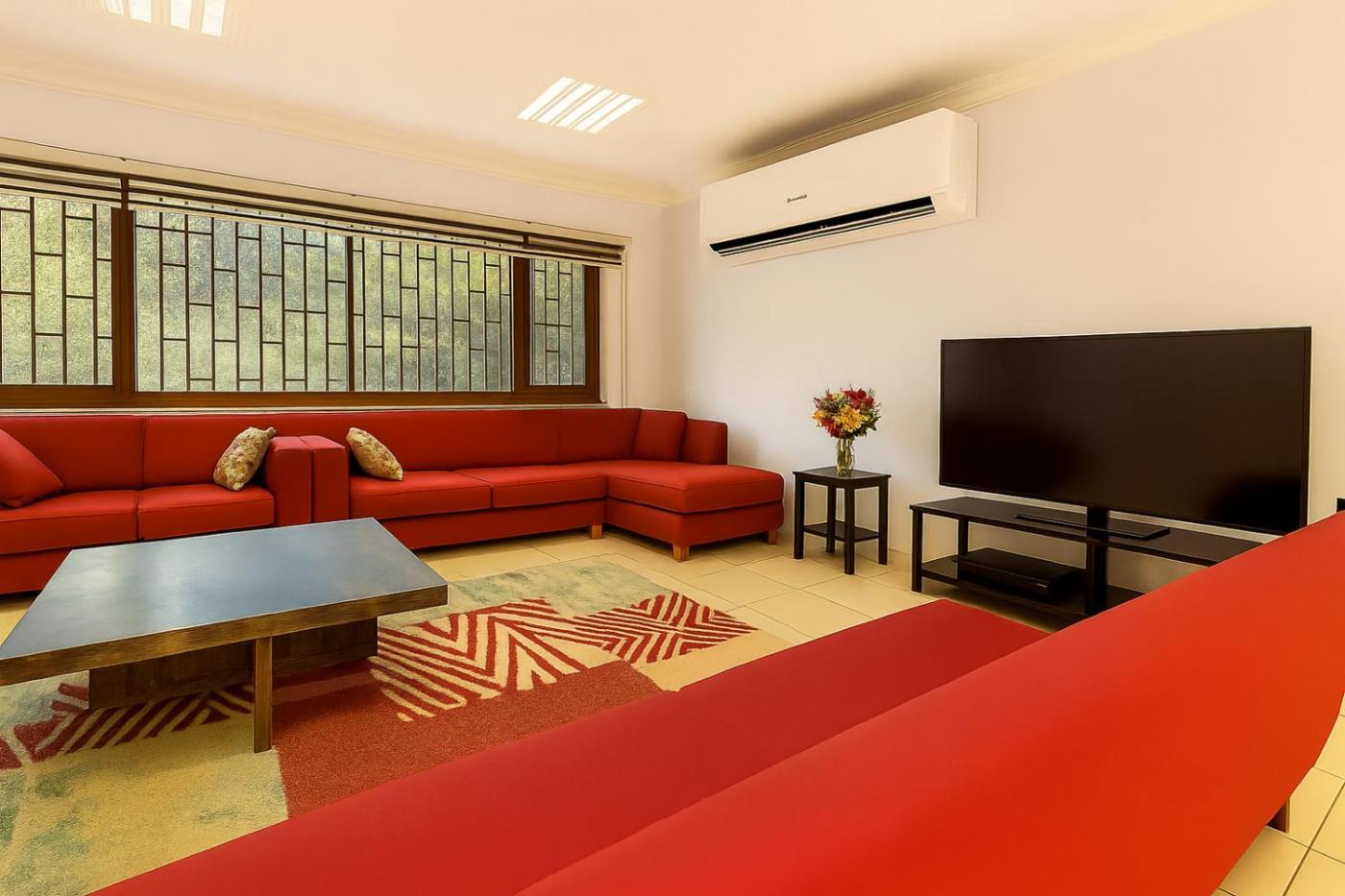 Three-Bedroom Deluxe Apartment. Boasting a private entrance, this air-conditioned apartment includes 1 living room, 3 separate bedrooms and 2 bathrooms with a shower and a bidet. Guests will find a stovetop, a refrigerator, kitchenware and an oven in the kitchen. The apartment also features a barbecue. The spacious apartment offers a washing machine, soundproof walls, a seating area, a flat-screen TV with streaming services, as well as garden views. The unit has 9 beds.