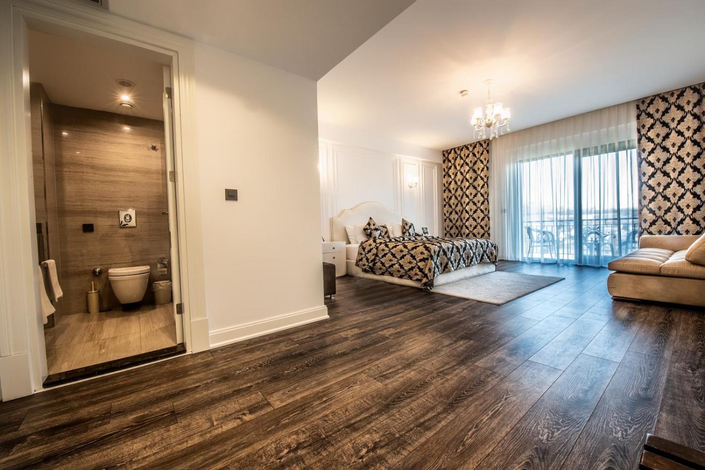 King Suite with Spa Bath. This suites special feature is the hot tub. Featuring a private entrance, this air-conditioned suite comprises 1 living room, 1 separate bedroom and 2 bathrooms with a walk-in shower and a bath. The spacious suite provides a flat-screen TV with cable channels, soundproof walls, a minibar, a tea and coffee maker as well as mountain views. The unit offers 3 beds. ;